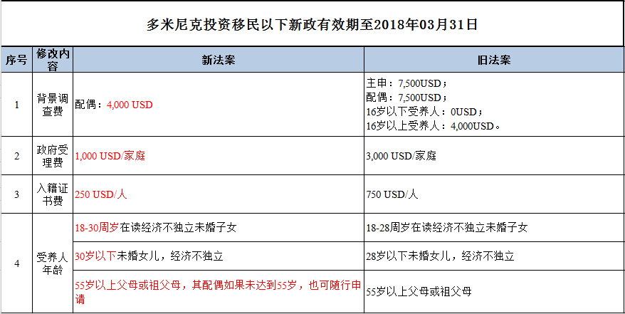 费用方面:根据多米尼克投资移民新政,其中多米尼克投资移民的配偶背景调查费比之前的旧法案下降了3500美元;政府受理费一项相比之前下调了2000美金/家庭;入籍证书费下调500美金/人。